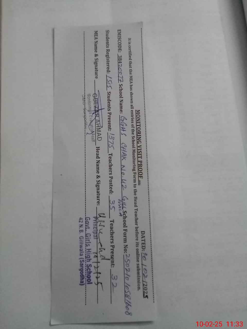 | EMIS Code: 38420077 | Name of School: GGHS CHAK NO.42 NB GILL WALA | |||
