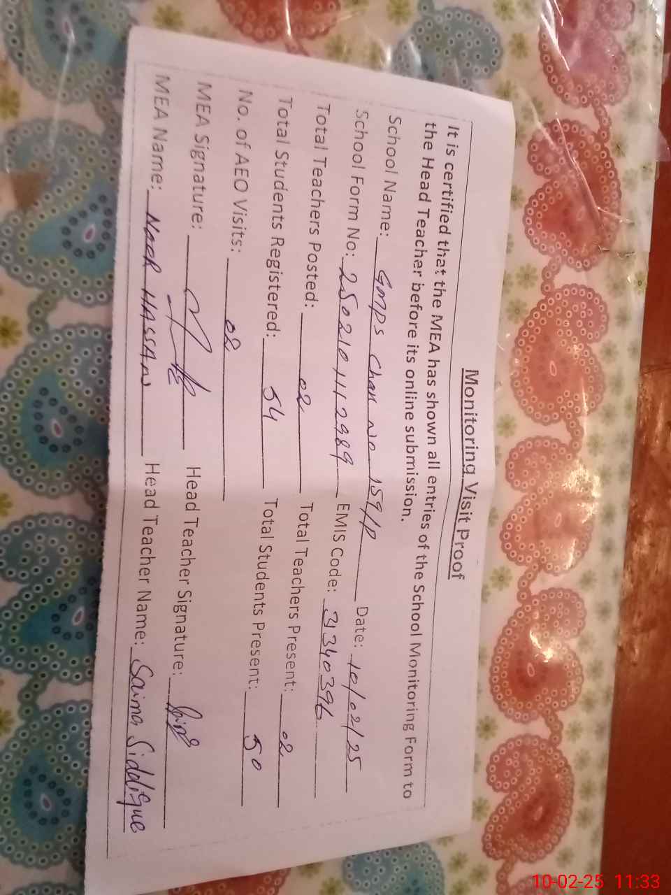 | Attendance Register | Head Teacher | MEA with School | Visit Proof |