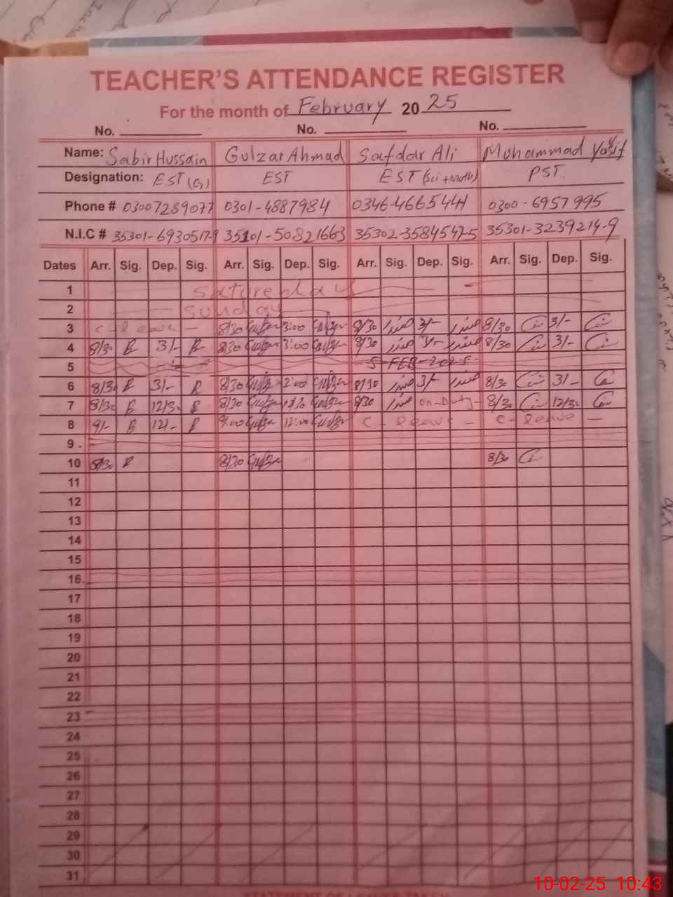 | CNIC | Full Name | Designation | R/C | Absence During Last Calender Month |