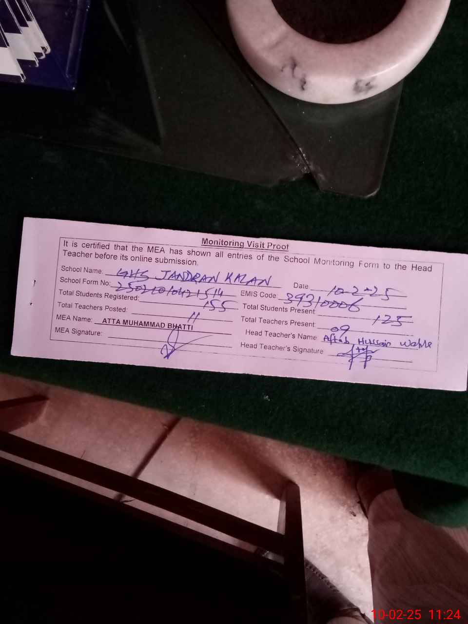 | Certified that this School was Inspected by the Undersigned MEA/DMO Today and the Information Stated Above is as Per Record. | |||||