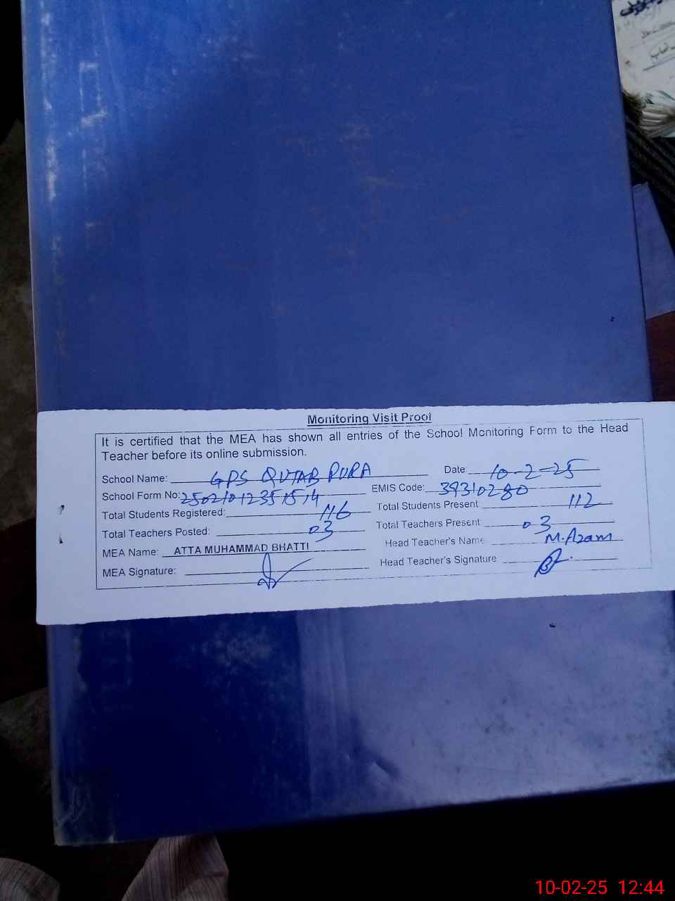 | EMIS Code: 39310280 | Name of School: GPS QUTAB PURA | |||