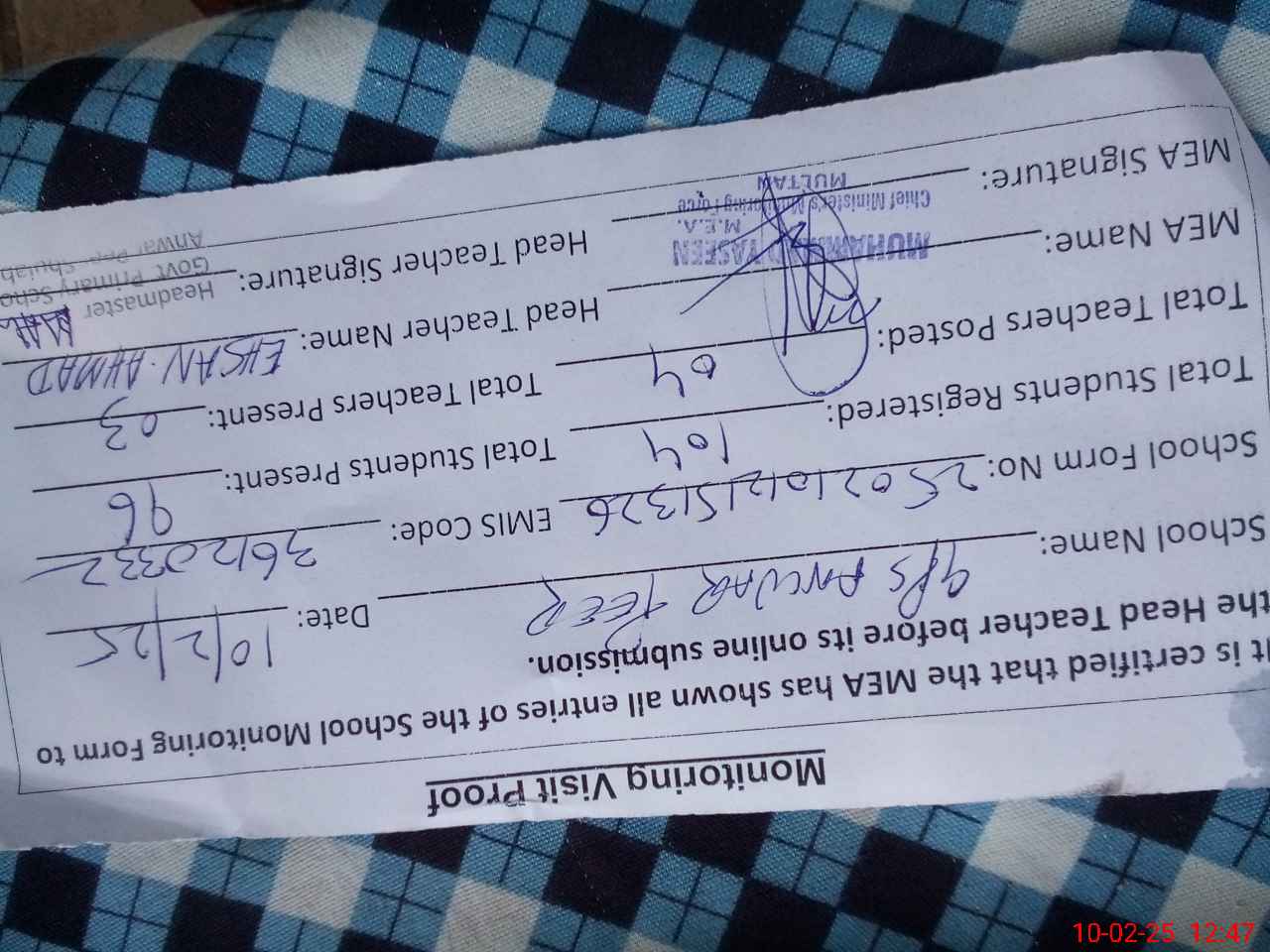| EMIS Code: 36120332 | Name of School: GPS ANWAR PEER SHUJABAD | |||
