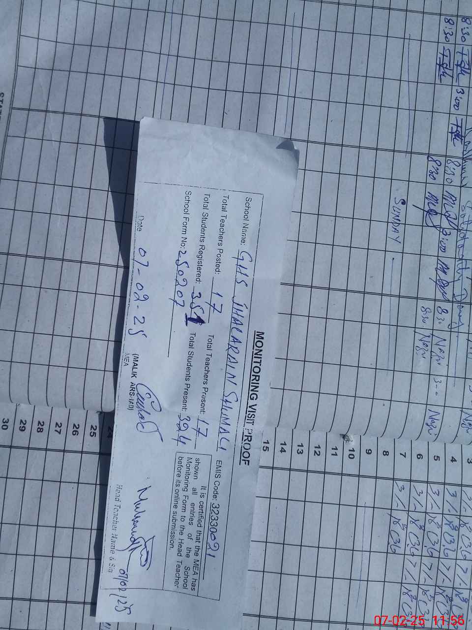 | Attendance Register | Head Teacher | MEA with School | Visit Proof |