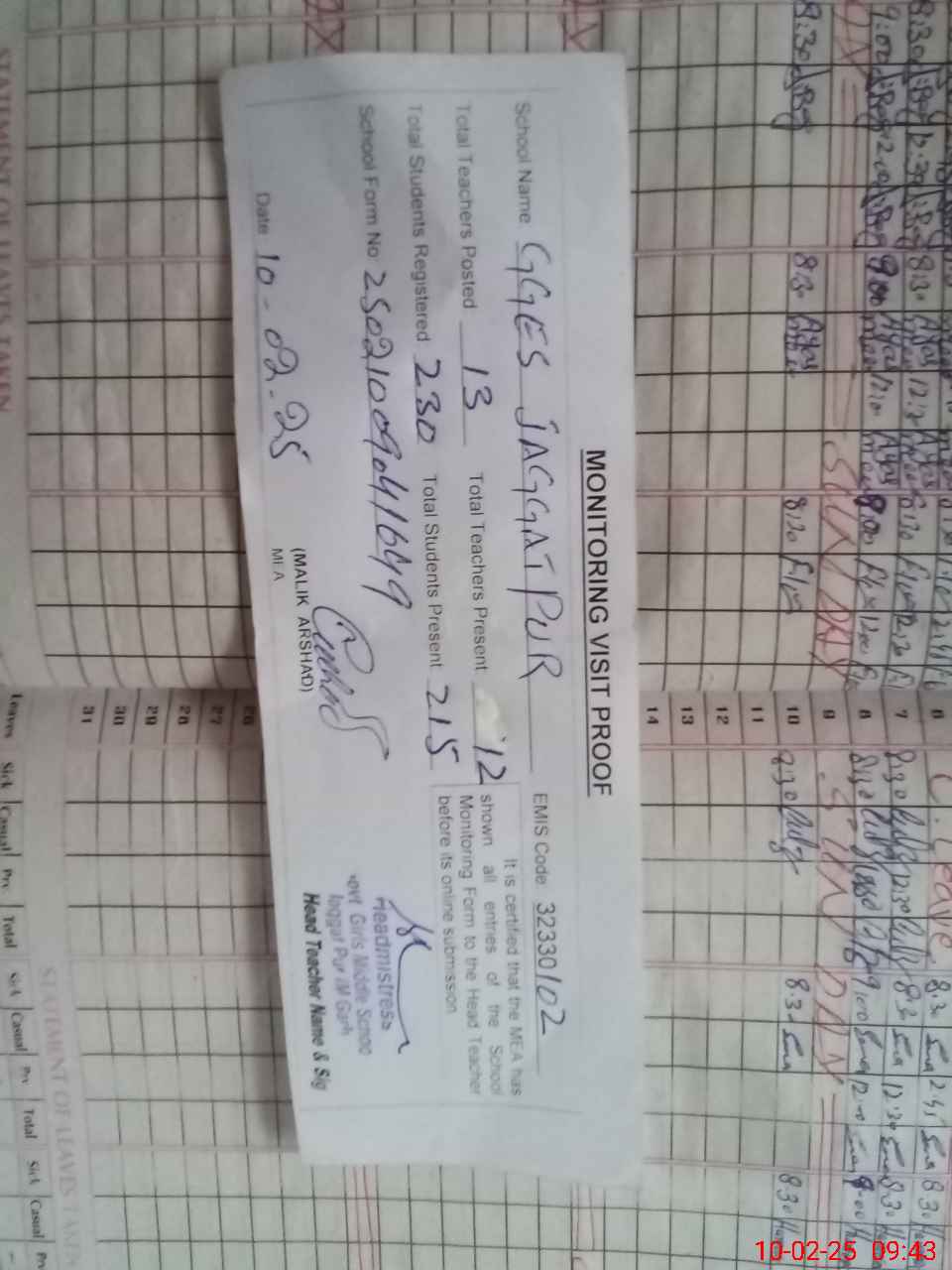 | Attendance Register | Head Teacher | MEA with School | Visit Proof |
