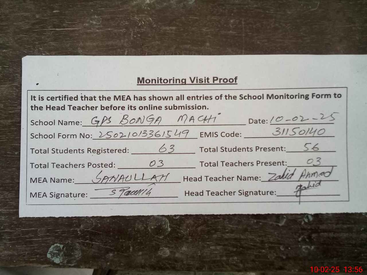 | Attendance Register | Head Teacher | MEA with School | Visit Proof |