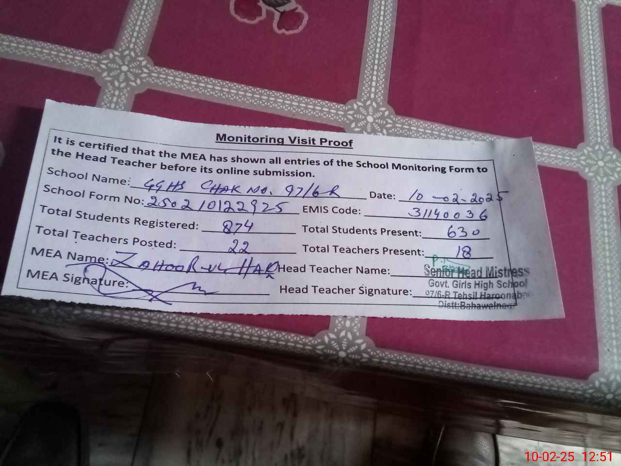 | Certified that this School was Inspected by the Undersigned MEA/DMO Today and the Information Stated Above is as Per Record. | |||||