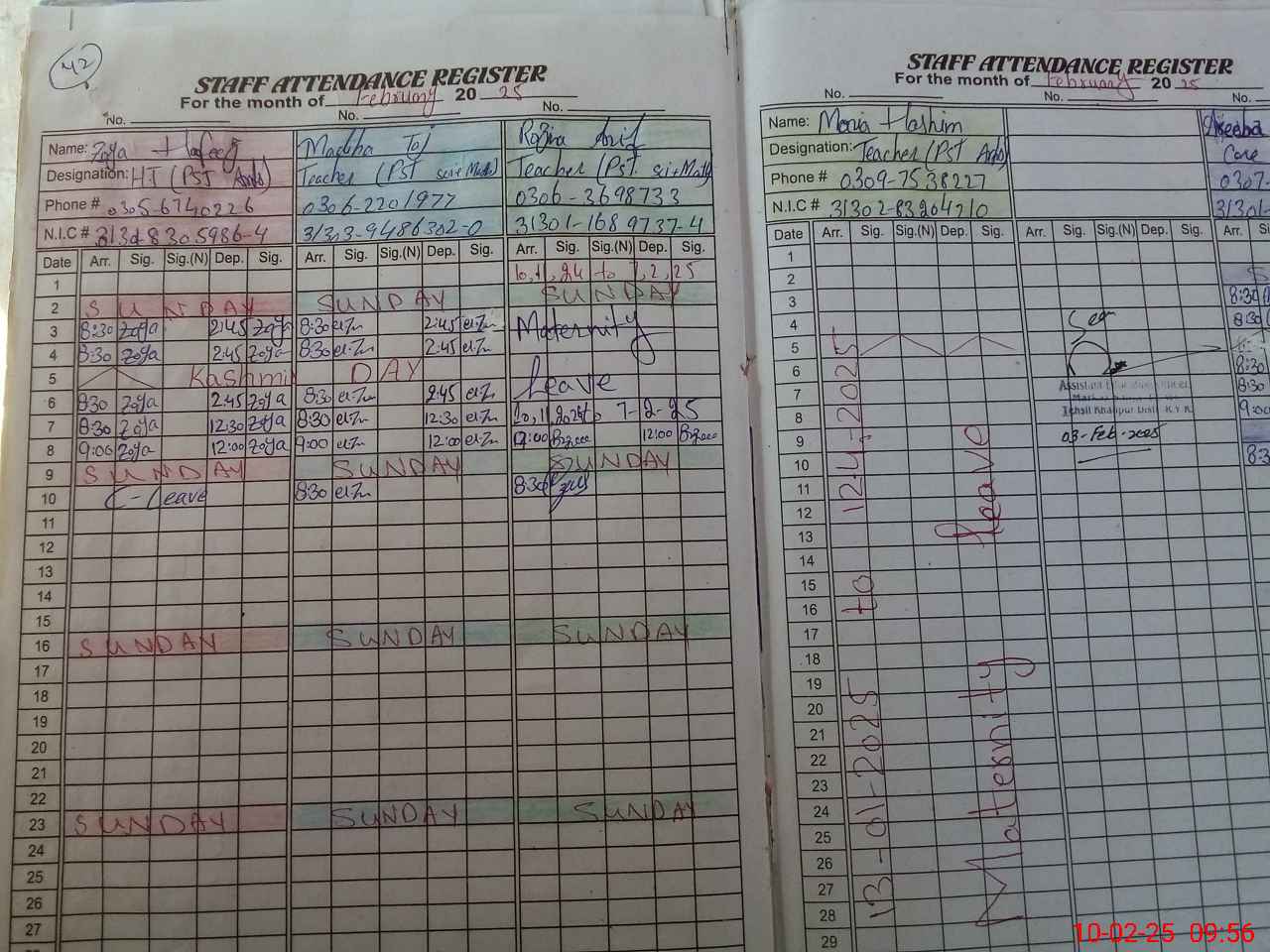 | CNIC | Full Name | Designation | R/C | Absence During Last Calender Month |