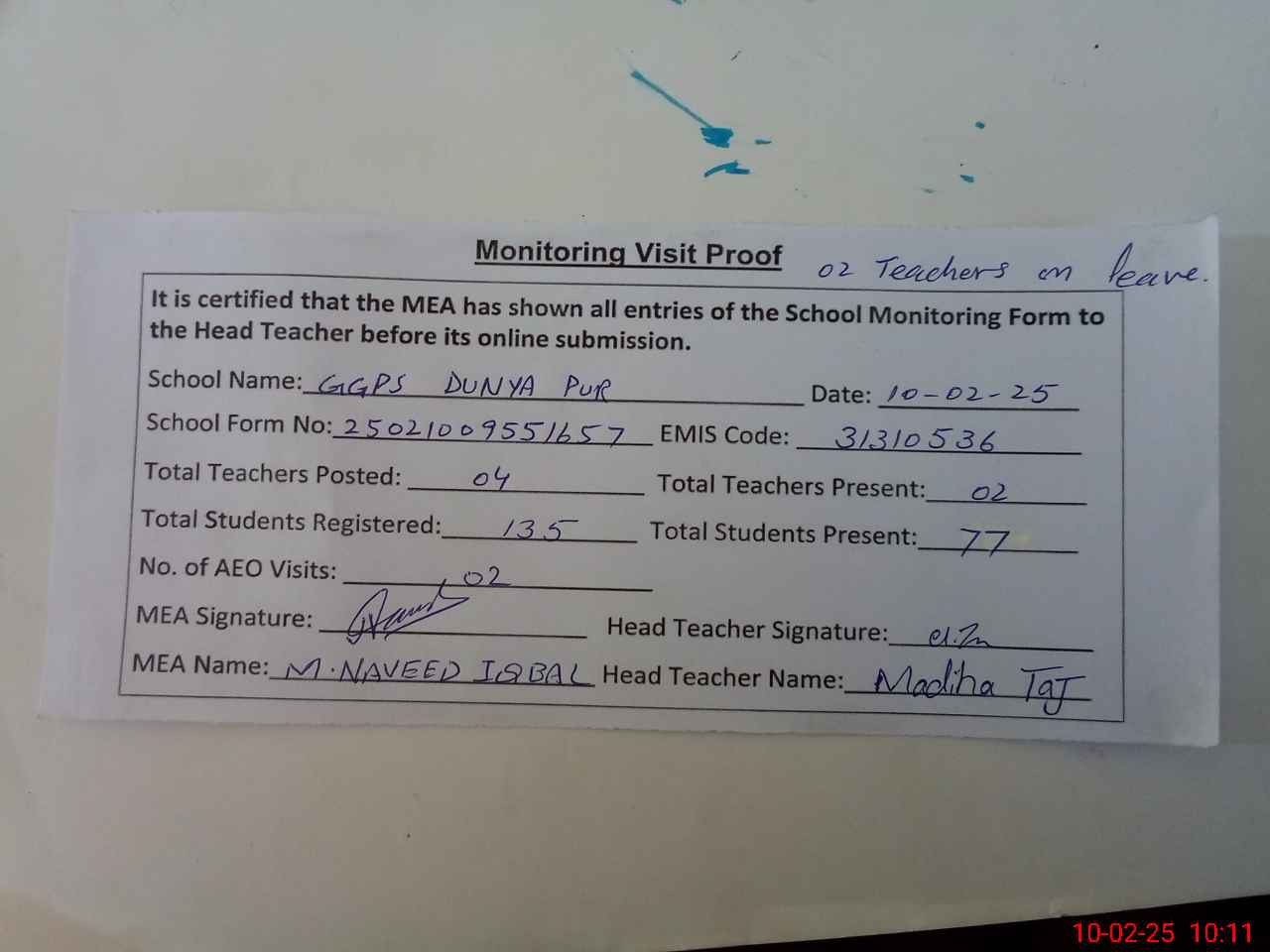 | Attendance Register | Head Teacher | MEA with School | Visit Proof |
