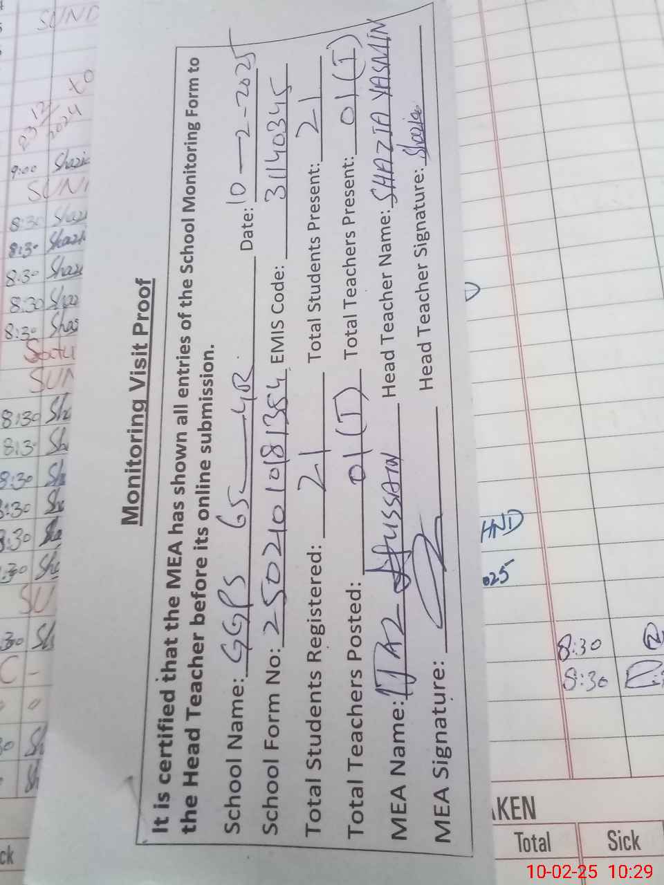 | Attendance Register | Head Teacher | MEA with School | Visit Proof |