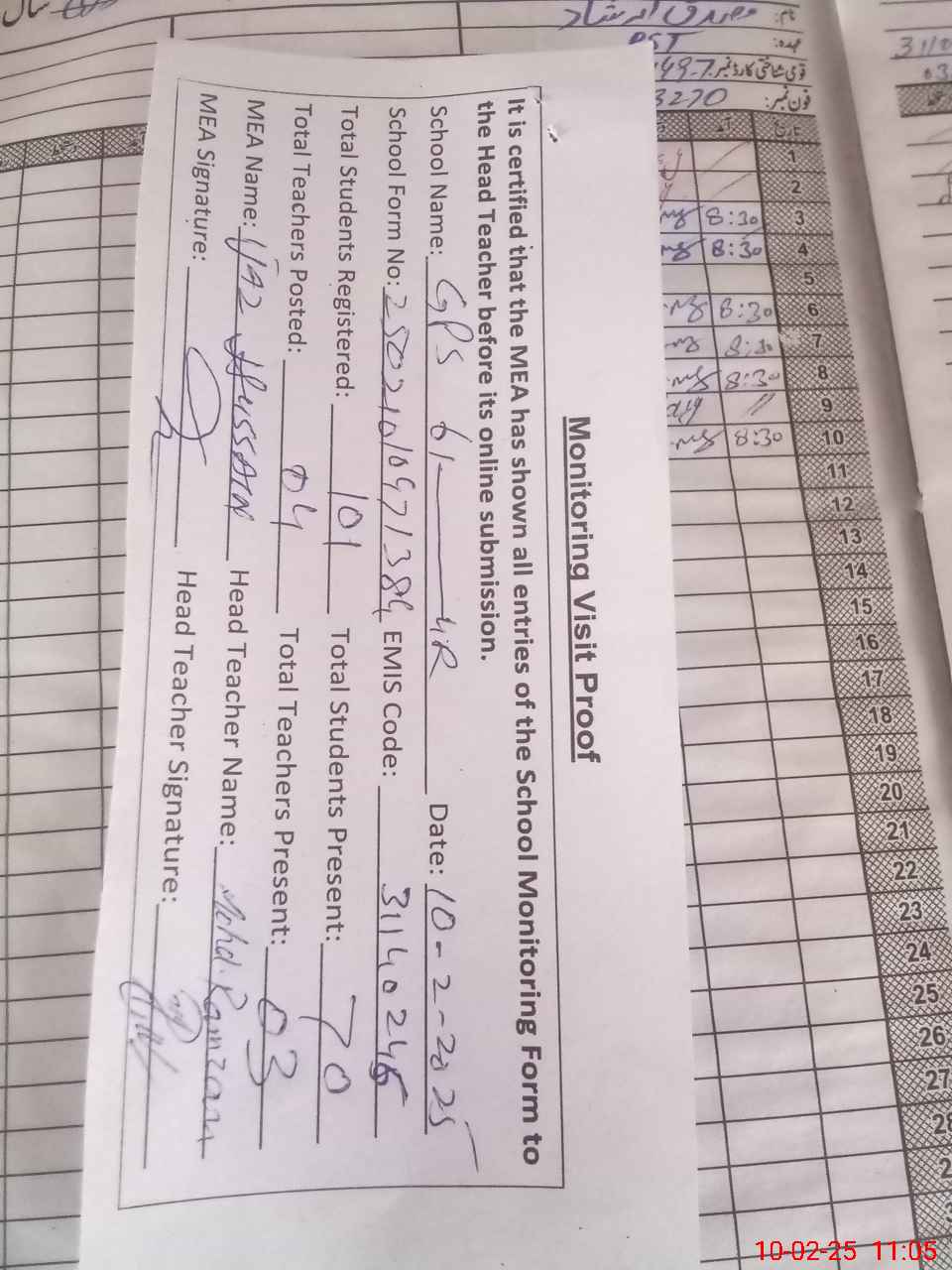 | Attendance Register | Head Teacher | MEA with School | Visit Proof |