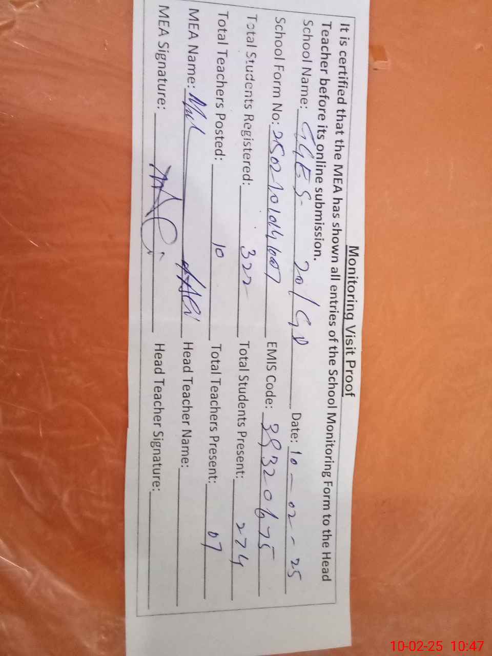| Attendance Register | Head Teacher | MEA with School | Visit Proof |