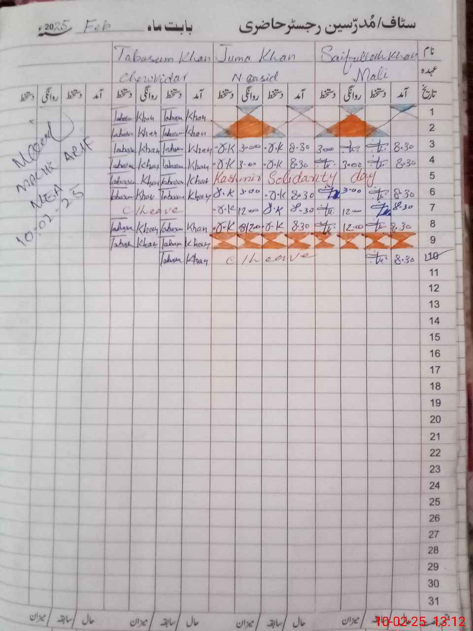 | 00**** | Ju**** Kh**** | NAIB QASID | Regular | 0 | 0 | 0 | 0 | 0 | 0 | 0 | 0 | 0 | Casual |