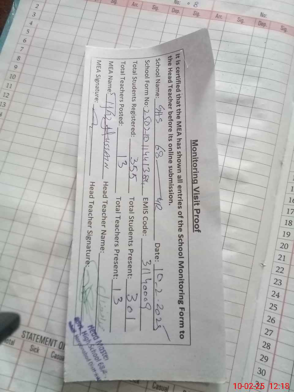 | Attendance Register | Head Teacher | MEA with School | Visit Proof |