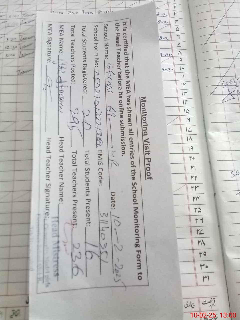 | Certified that this School was Inspected by the Undersigned MEA/DMO Today and the Information Stated Above is as Per Record. | |||||