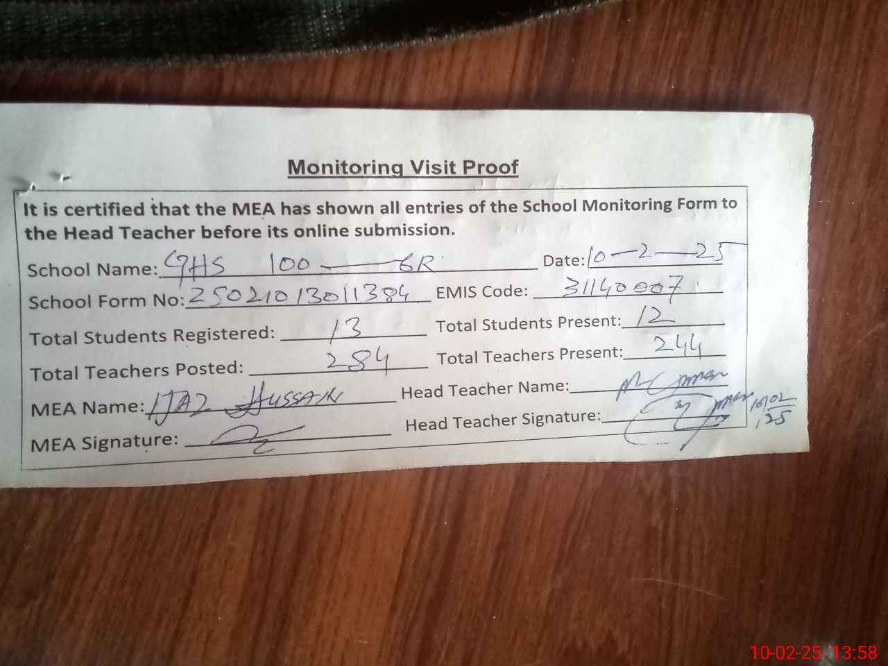 | EMIS Code: 31140017 | Name of School: GHS CHAK NO. 100/6-R | |||