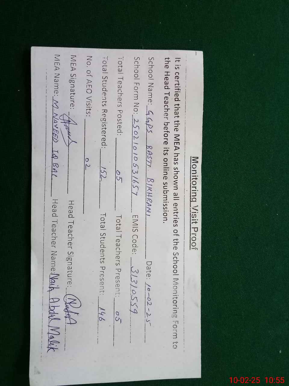 | Certified that this School was Inspected by the Undersigned MEA/DMO Today and the Information Stated Above is as Per Record. | |||||