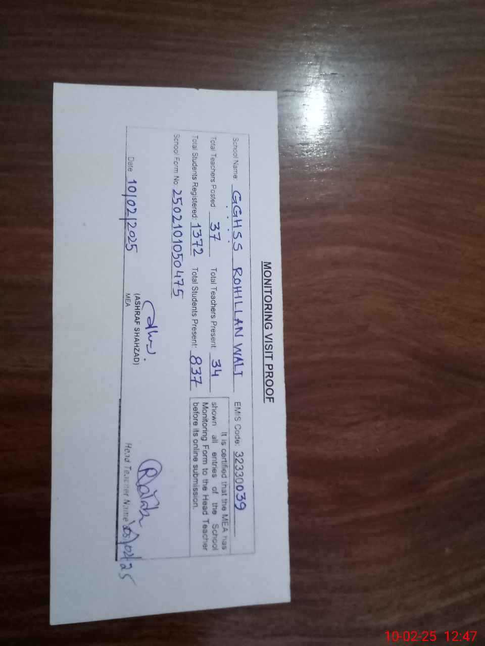 | Attendance Register | Head Teacher | MEA with School | Visit Proof |