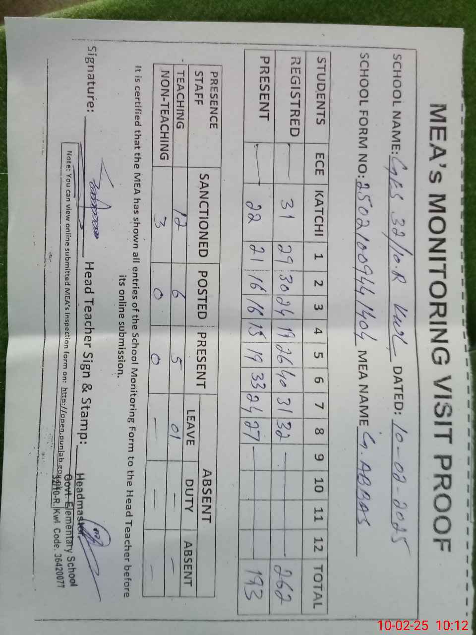 | Attendance Register | Head Teacher | MEA with School | Visit Proof |