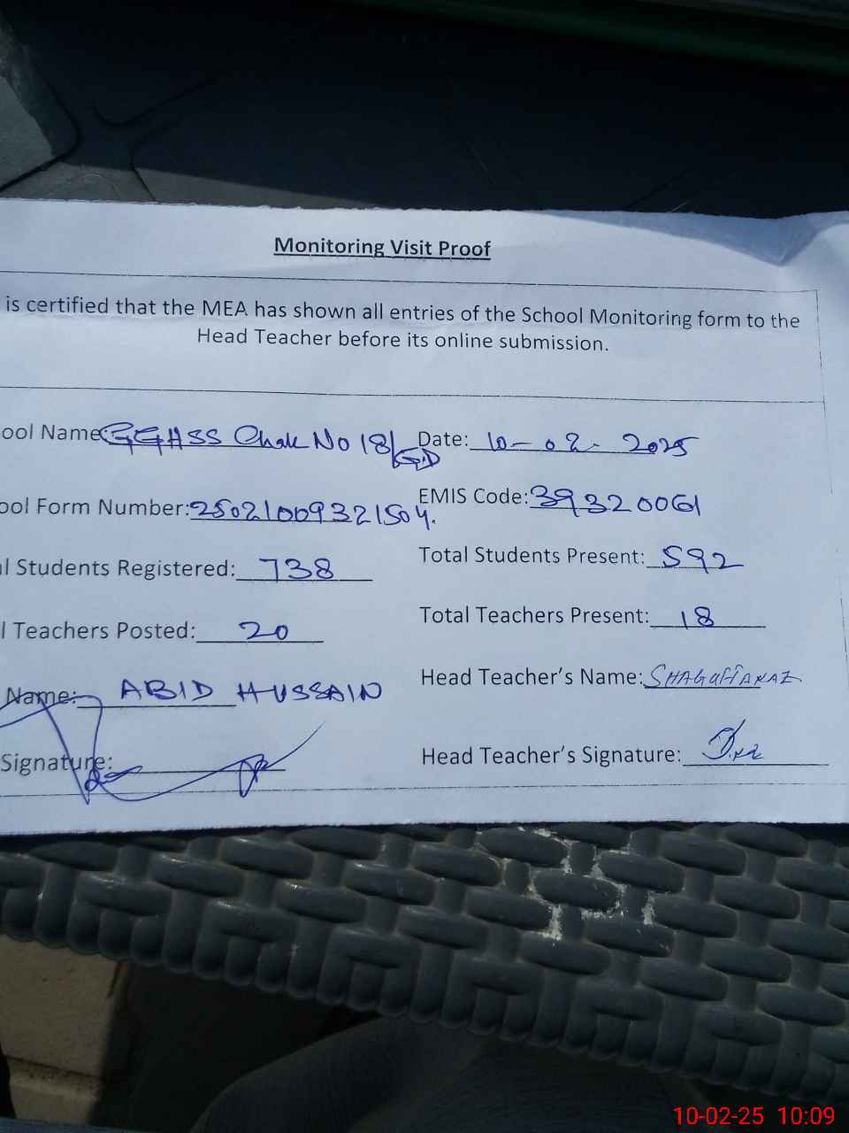 | Monitoring Date: 10-02-2025 | Start Time: 10-02-2025 09:32 AM | End Time: 10-02-2025 10:10 AM | Name of MEA: AB**** HU**** | |