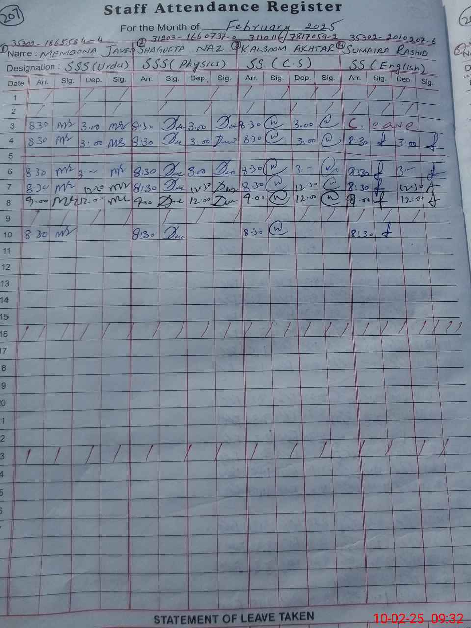 | CNIC | Full Name | Designation | R/C | Absence During Last Calender Month |