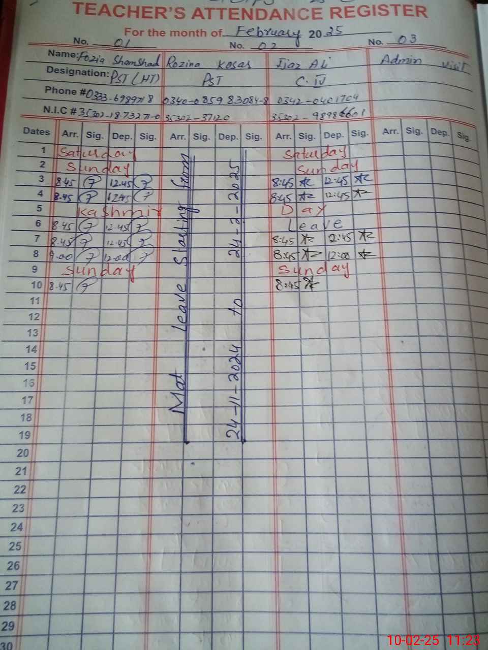 | CNIC | Full Name | Designation | R/C | Absence During Last Calender Month |