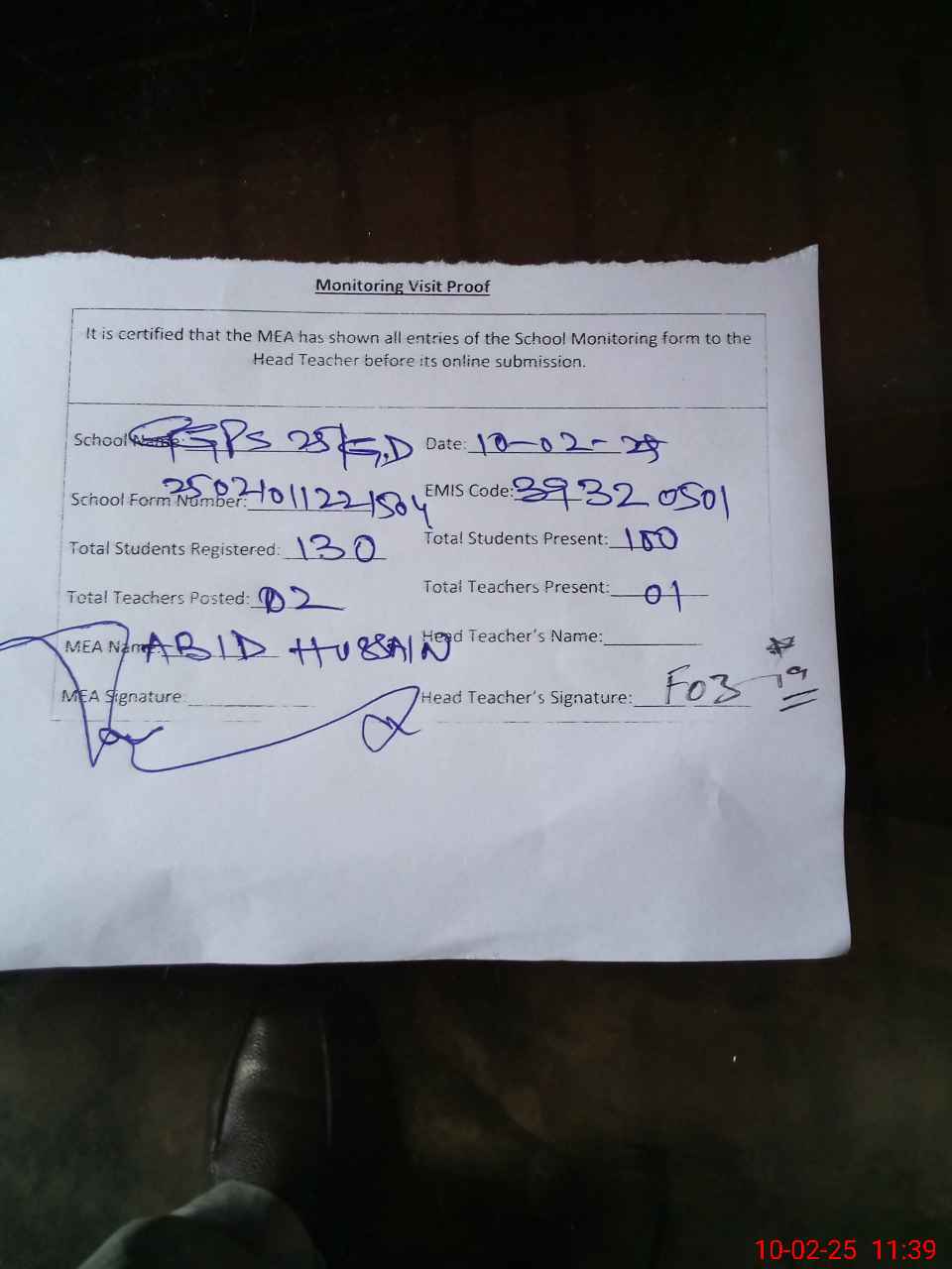 | Attendance Register | Head Teacher | MEA with School | Visit Proof |