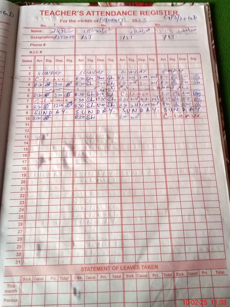 | CNIC | Full Name | Designation | R/C | Absence During Last Calender Month |