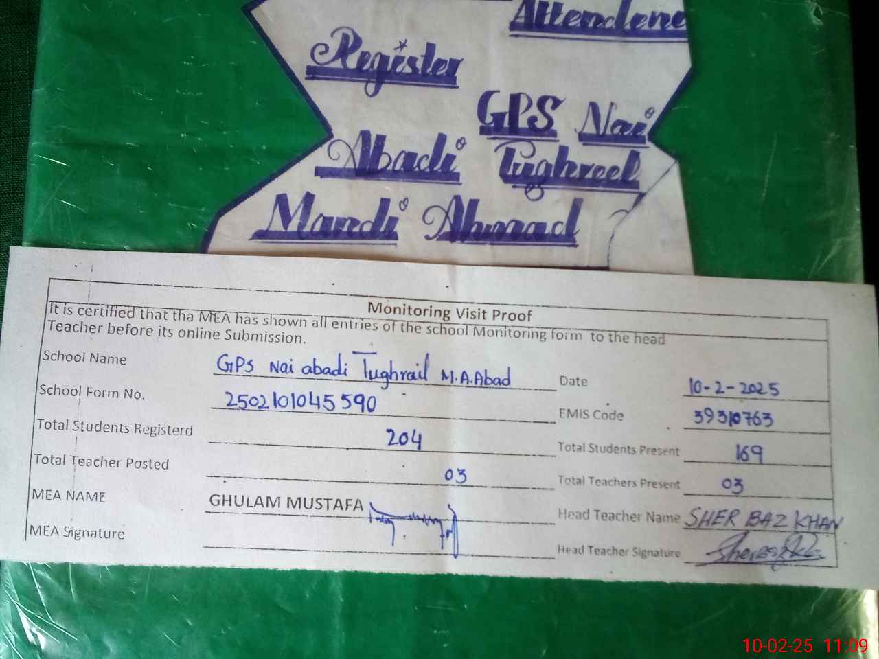 | Attendance Register | Head Teacher | MEA with School | Visit Proof |