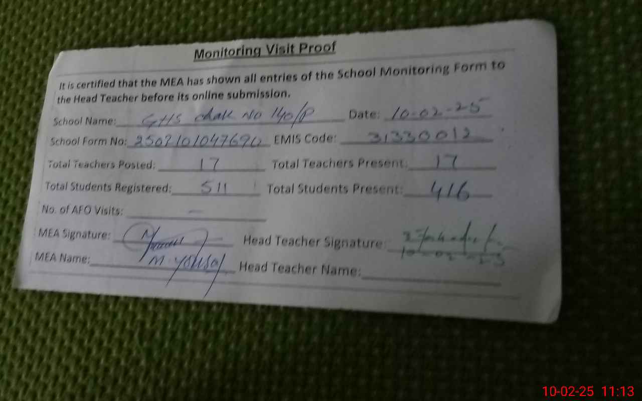 | EMIS Code: 31330012 | Name of School: GHS CHAK NO 140/P R.Y.KHAN | |||