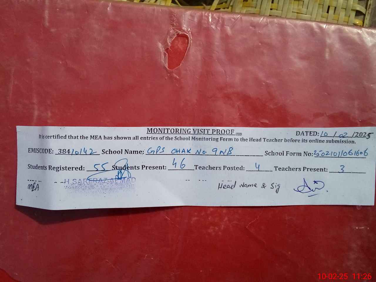 | Attendance Register | Head Teacher | MEA with School | Visit Proof |