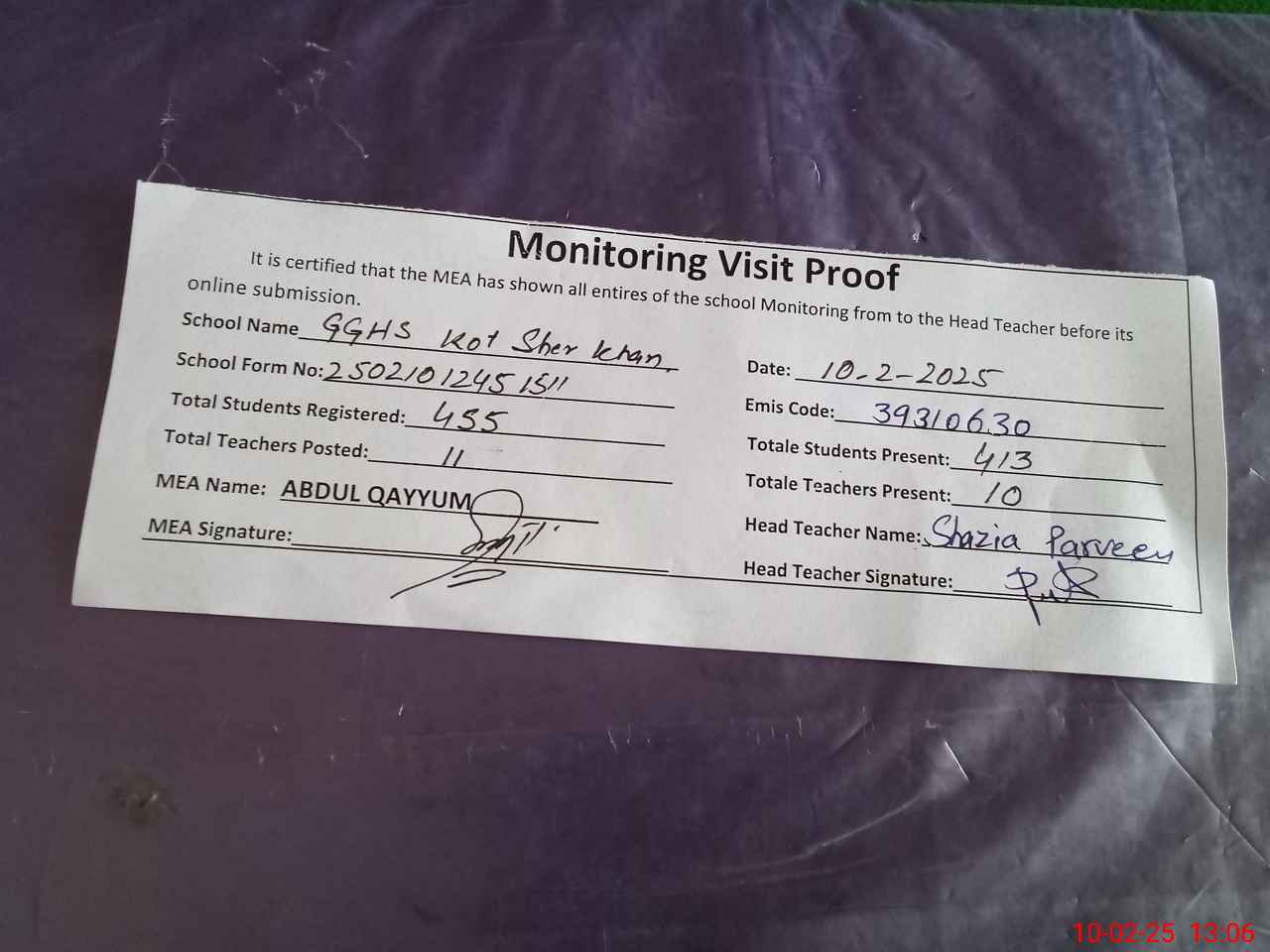 | Attendance Register | Head Teacher | MEA with School | Visit Proof |