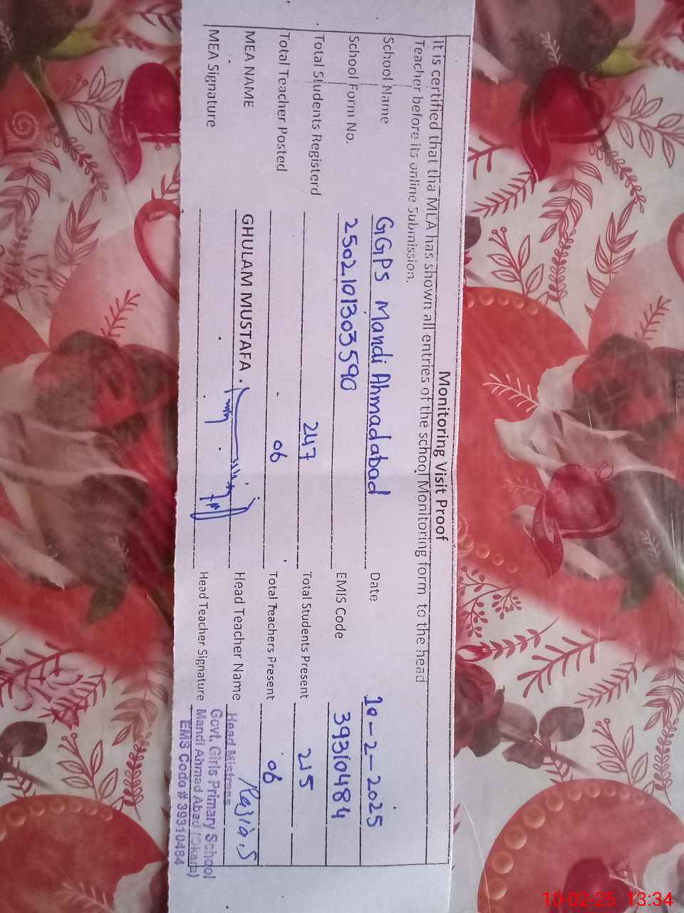 | EMIS Code: 39310484 | Name of School: GGPS MANDI AHMED ABAD | |||