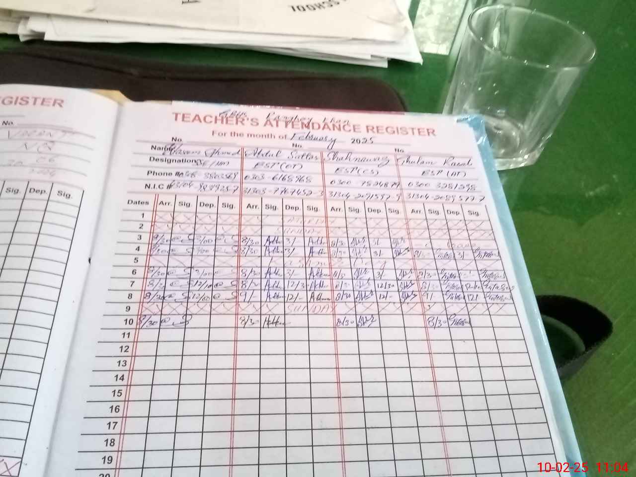 | CNIC | Full Name | Designation | R/C | Absence during last cal. month |