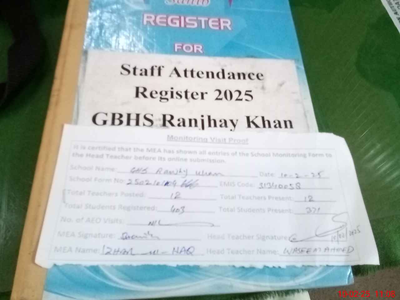 | Attendance Register | Head Teacher | MEA with School | Visit Proof |