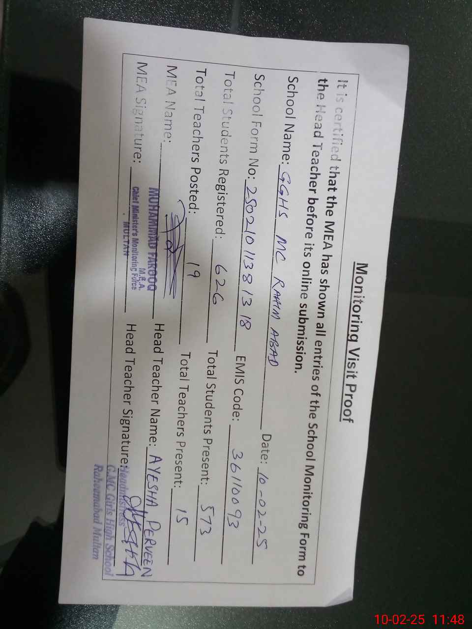 | EMIS Code: 36110093 | Name of School: GGHS MC RAHIM ABAD MULTAN | |||