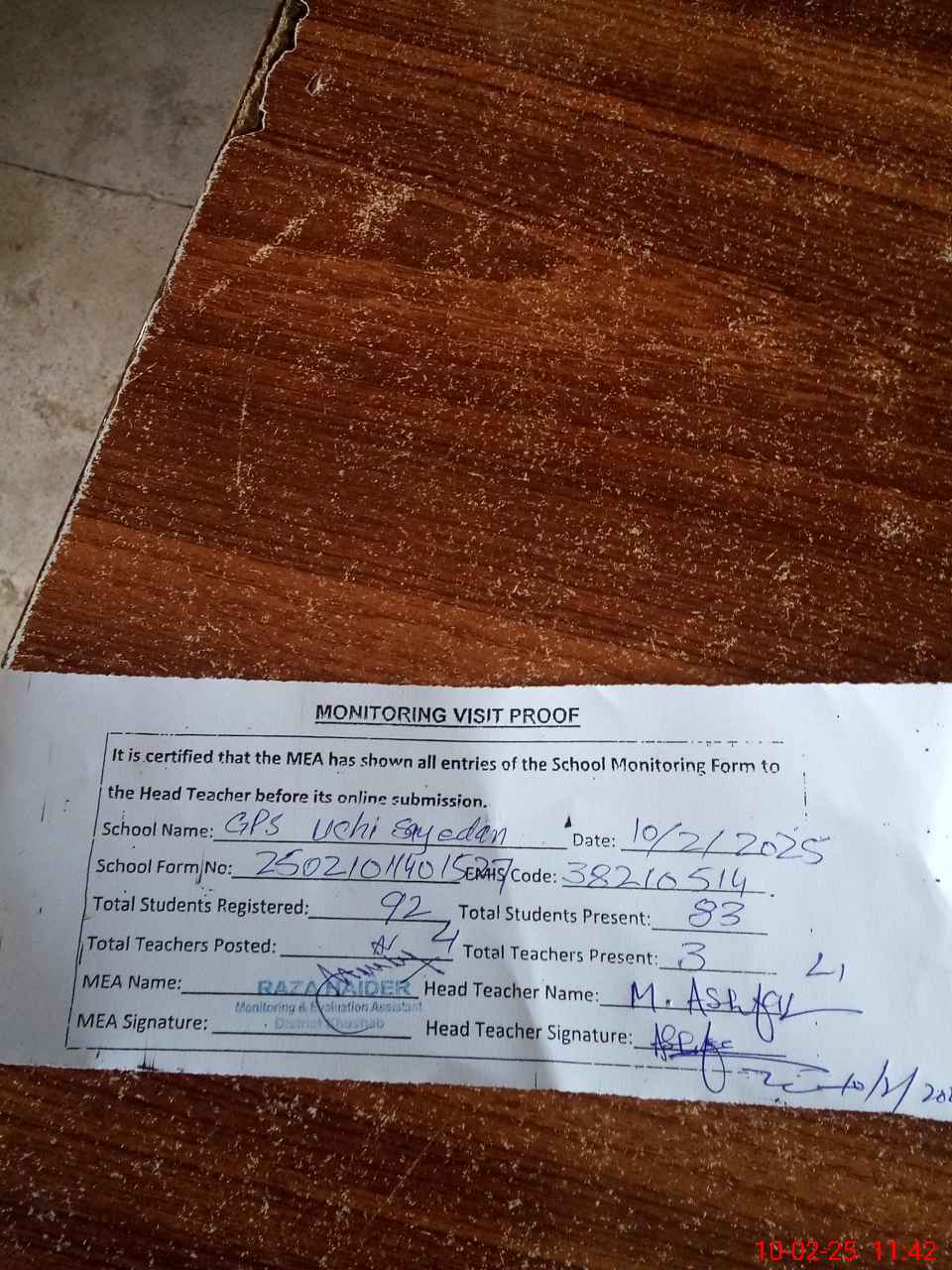 | Attendance Register | Head Teacher | MEA with School | Visit Proof |