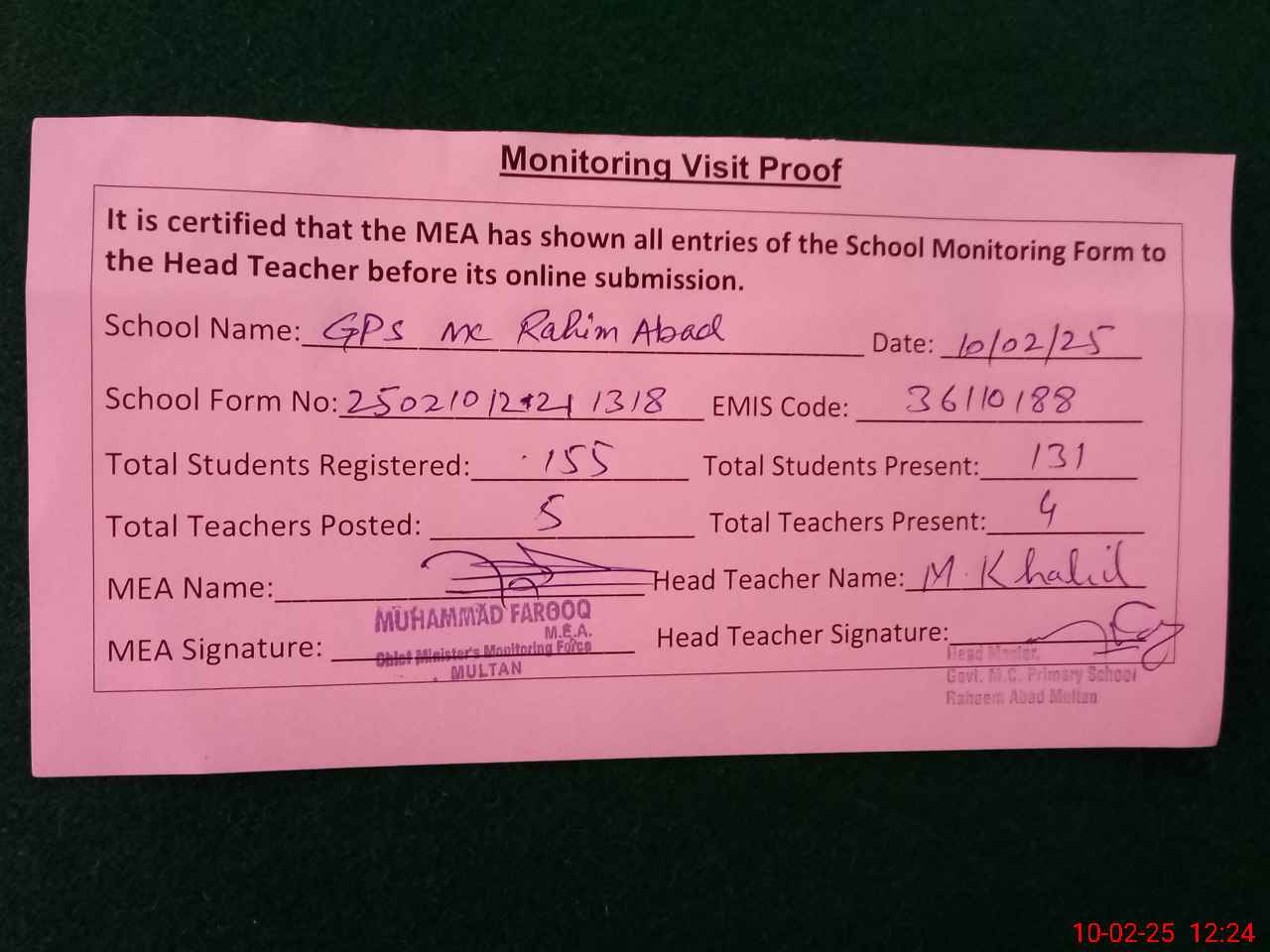 | EMIS Code: 36110188 | Name of School: GPS MC RAHIMABAD MULTAN | |||
