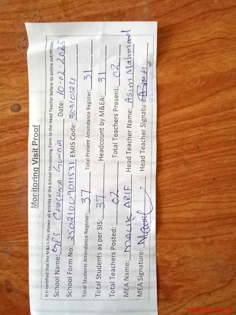 | Attendance Register | Head Teacher | MEA with School | Visit Proof |