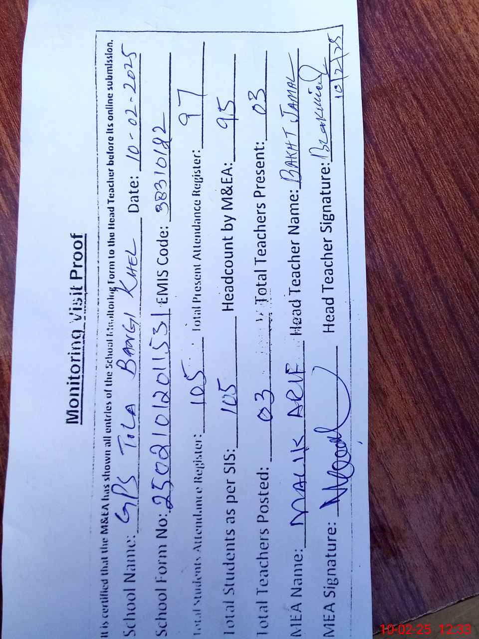 | Attendance Register | Head Teacher | MEA with School | Visit Proof |
