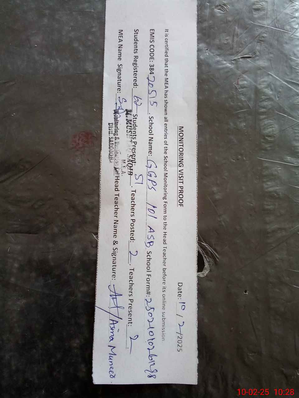 | EMIS Code: 38420515 | Name of School: GGPS CHAK NO.101 ASSIAN WALA BADLA | |||