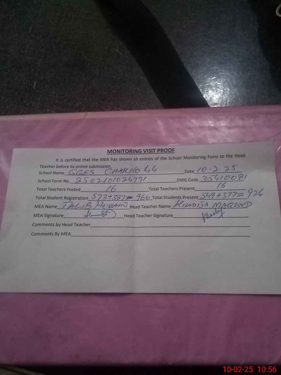 | Certified that this School was Inspected by the Undersigned MEA/DMO Today and the Information Stated Above is as Per Record. | |||||