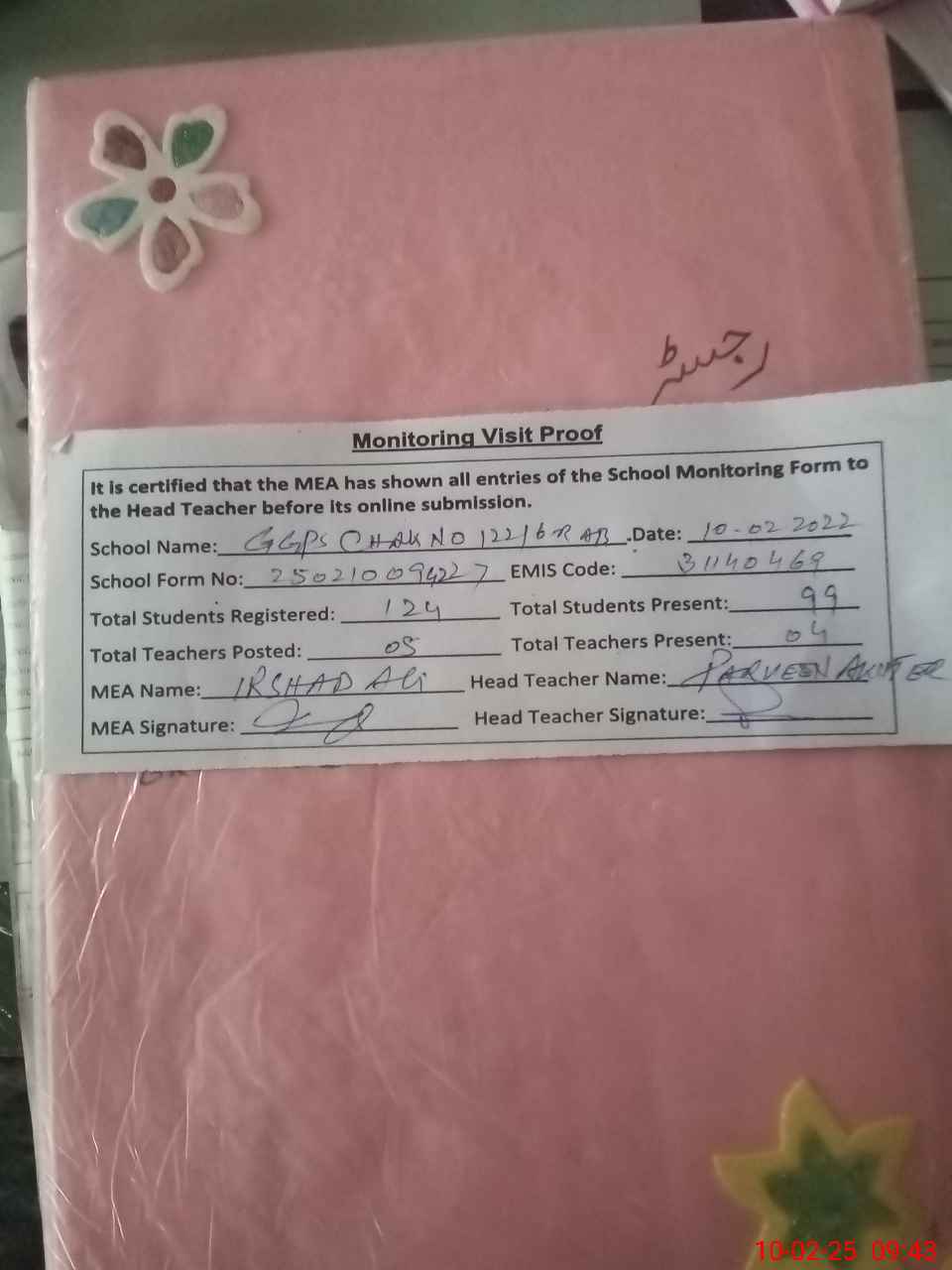 | Attendance Register | Head Teacher | MEA with School | Visit Proof |