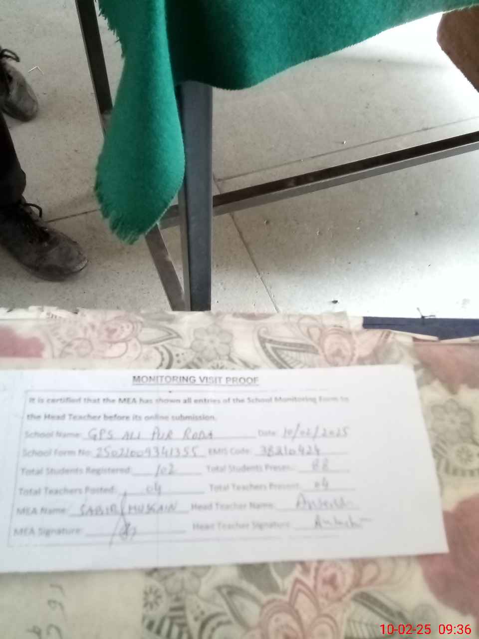 | Attendance Register | Head Teacher | MEA with School | Visit Proof |