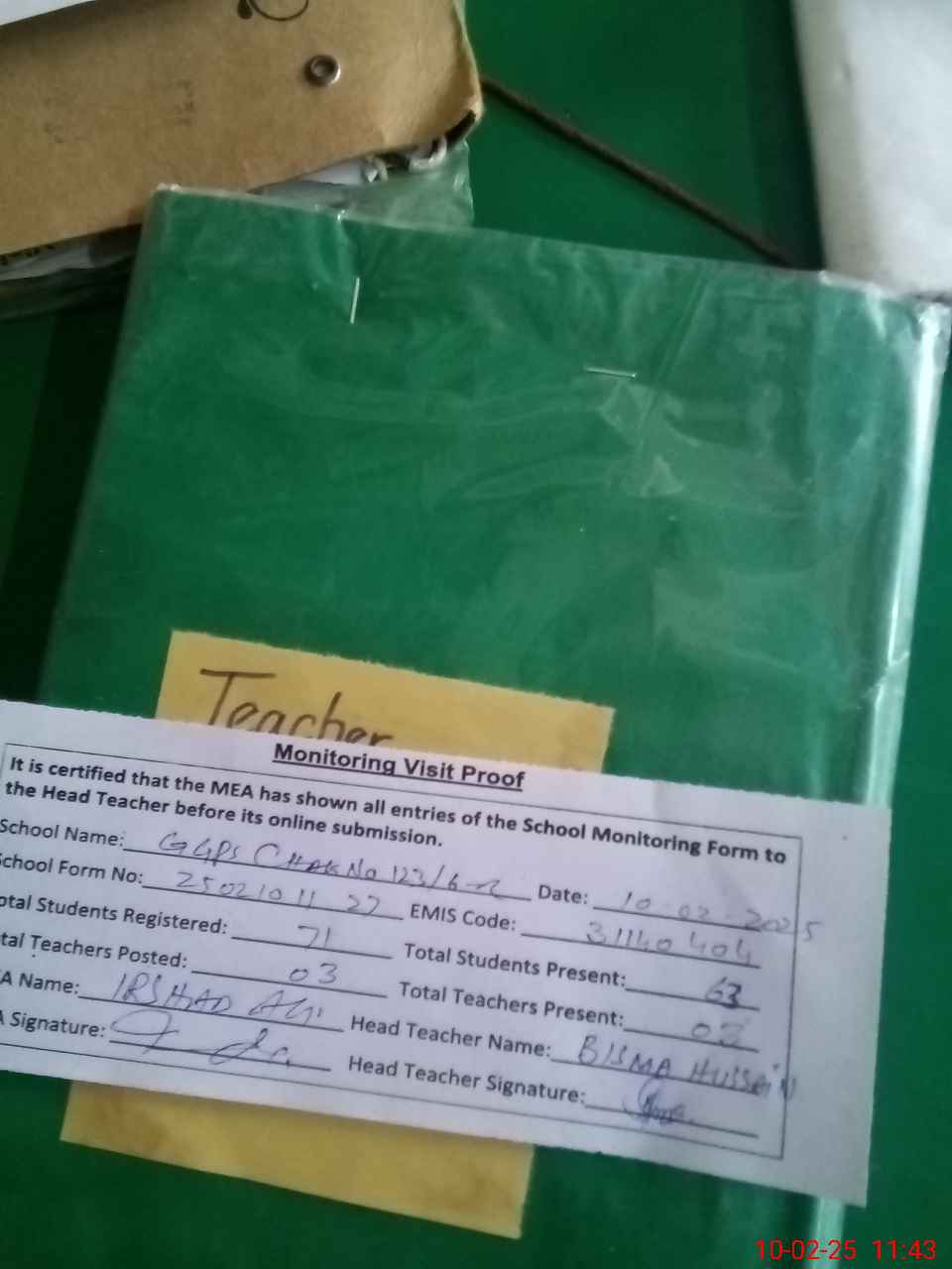 | Attendance Register | Head Teacher | MEA with School | Visit Proof |