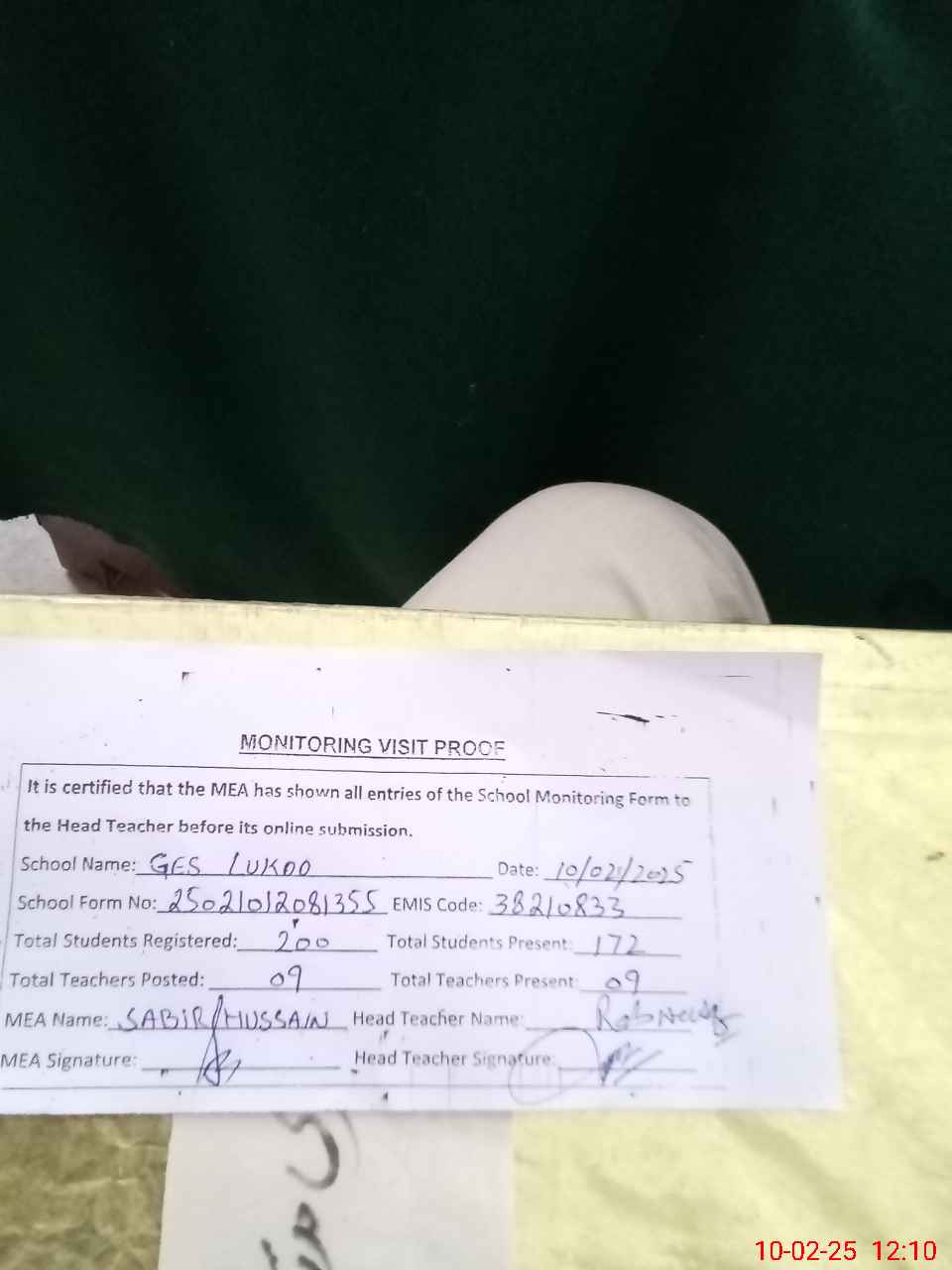 | Attendance Register | Head Teacher | MEA with School | Visit Proof |
