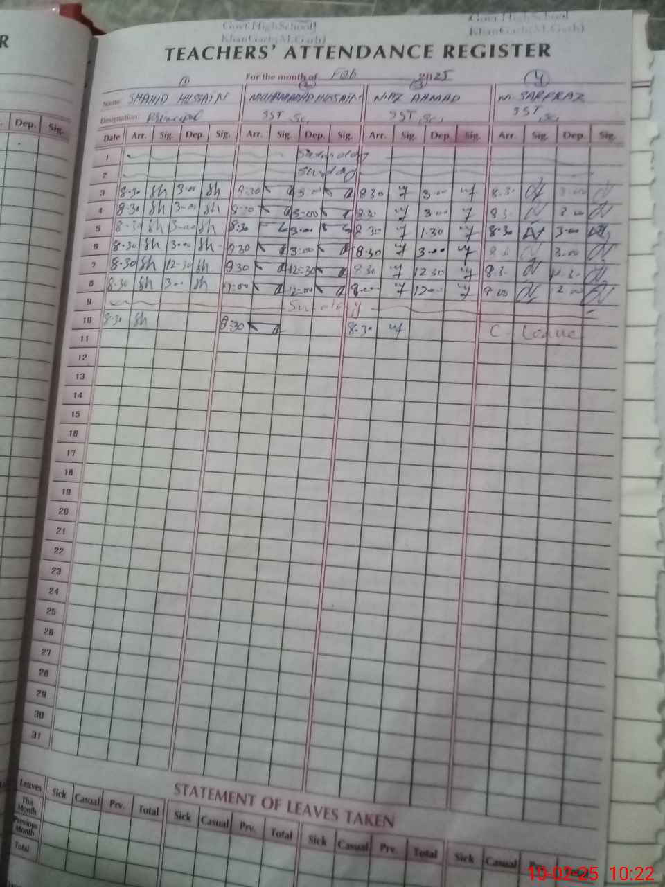 | CNIC | Full Name | Designation | R/C | Absence During Last Calender Month |