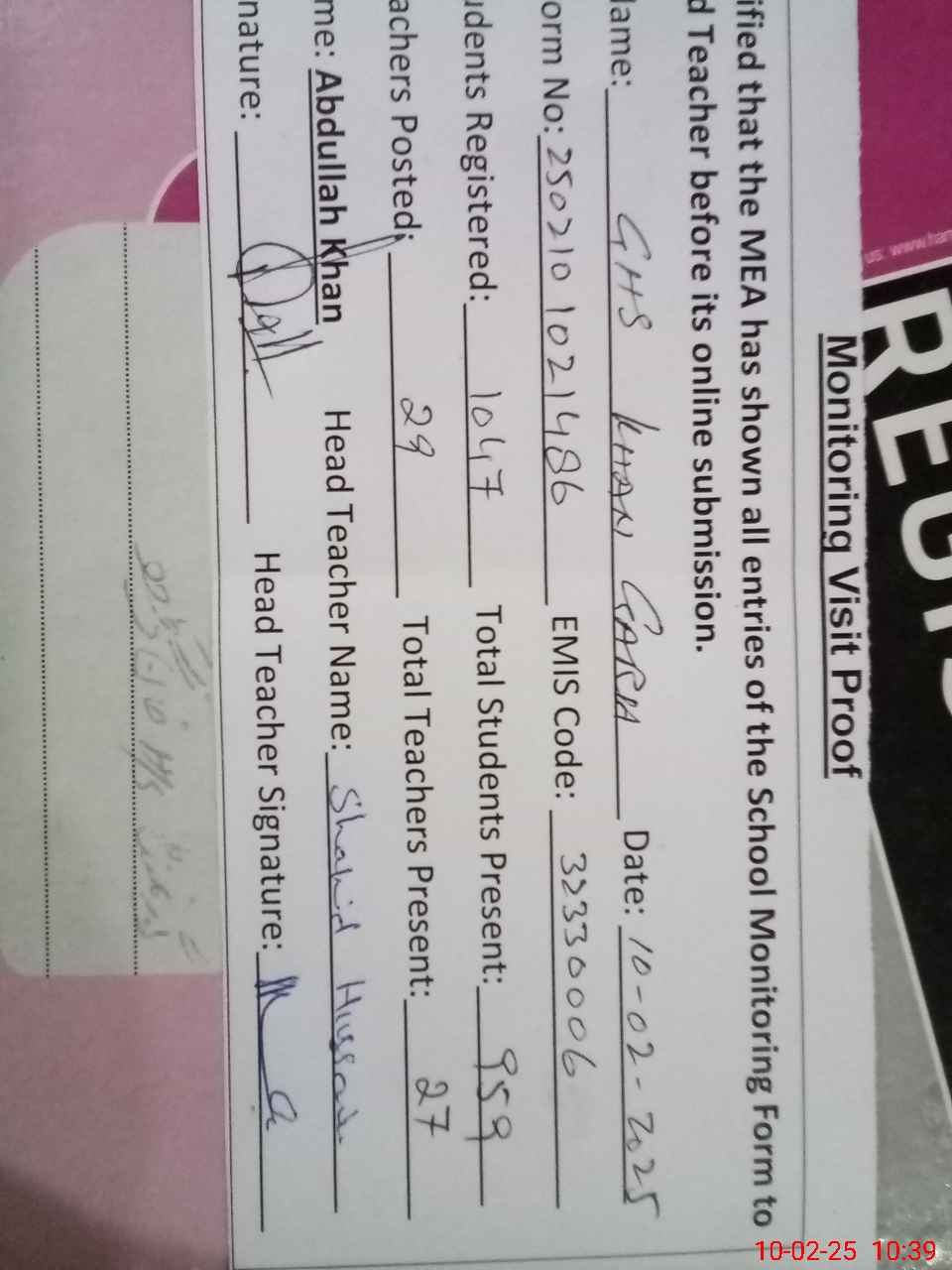 | Attendance Register | Head Teacher | MEA with School | Visit Proof |