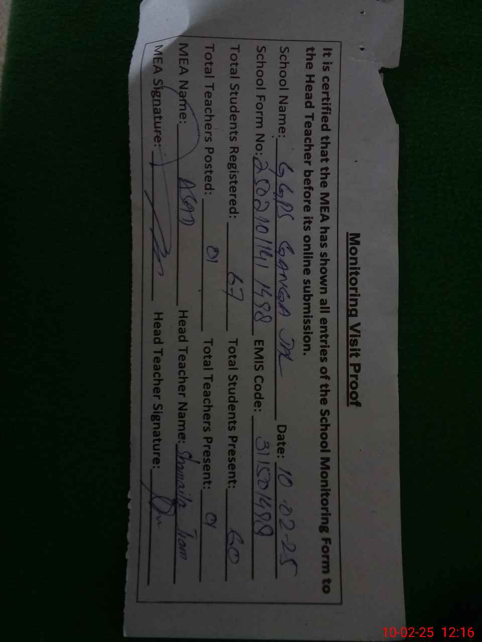 | Attendance Register | Head Teacher | MEA with School | Visit Proof |