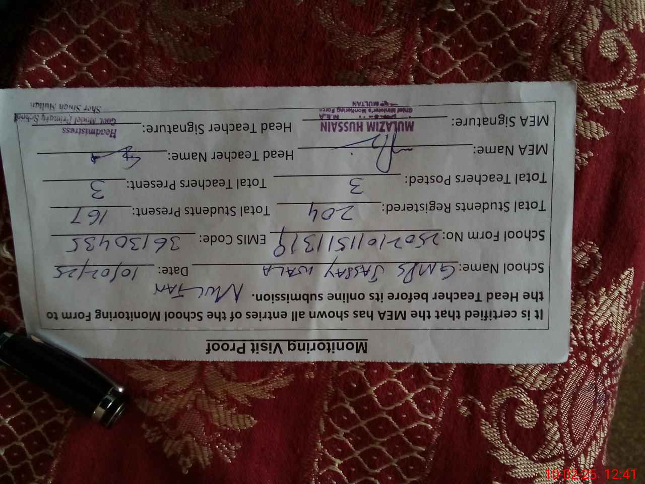 | Certified that this School was Inspected by the Undersigned MEA/DMO Today and the Information Stated Above is as Per Record. | |||||