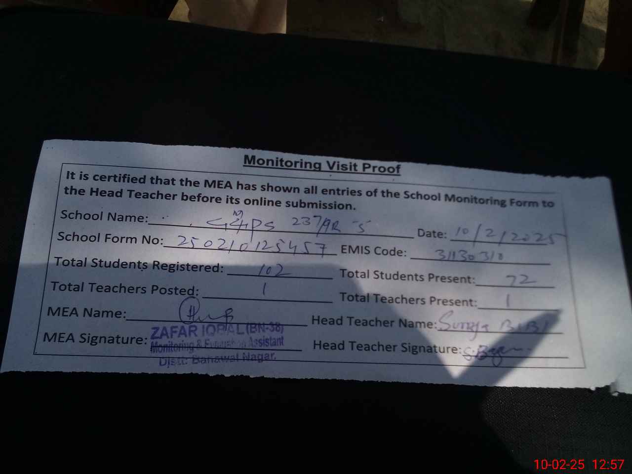 | Monitoring Date: 10-02-2025 | Start Time: 10-02-2025 12:38 PM | End Time: 10-02-2025 12:58 PM | Name of MEA: Za**** Iq**** BN**** | |